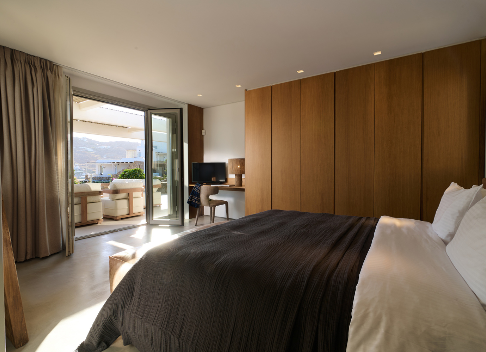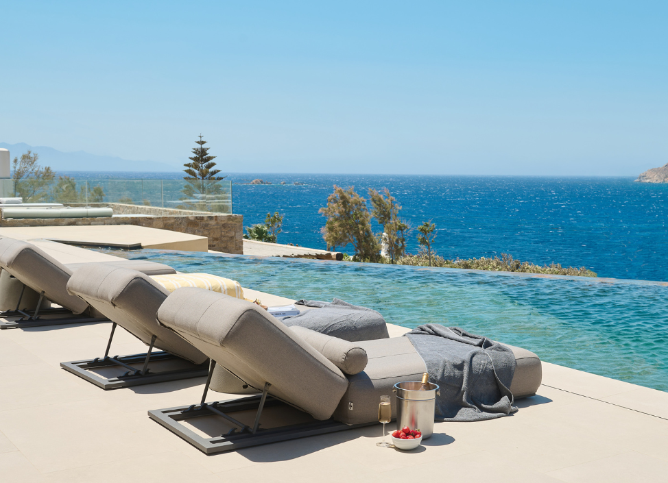 À l’extérieur, la piscine privée invite à la détente sous le soleil des Cyclades, offrant un cadre idyllique pour se relaxer ou organiser des instants festifs face à la beauté naturelle de l’île.